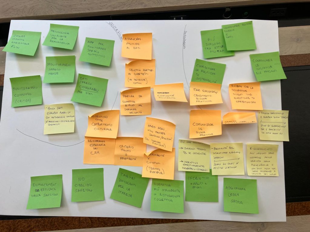 Following the welcome and introduction of the participants, members of the Italian WASTEWISE team gave a presentation on the state of food waste policy entitled ‘Between ambition and reality: the coherence of policies on food loss and waste’. This was followed by an interactive session in which potential measures to reduce food waste and losses were identified and the integration of these proposals was discussed. Finally, participants completed the MAP questionnaire.